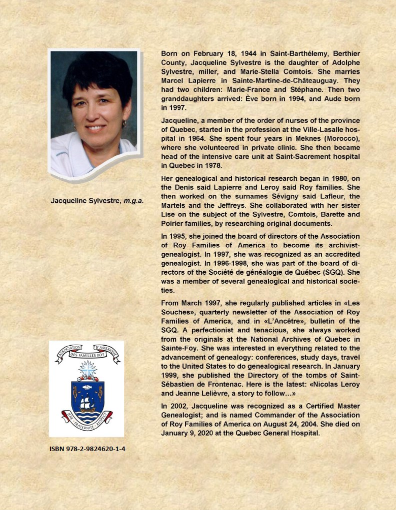 Twenty years after his first publication in french, this book from Jacqueline Sylvestre, commandeur of AFROY (#213) and certified genealogist, «Nicolas Leroy et Jeanne Lelièvre» in french was reviewed, corrected with more details added. A book on this family of more than 208 pages.