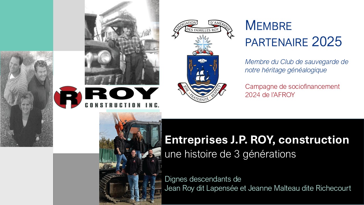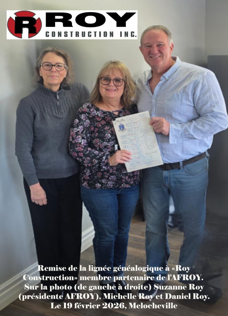 Suzanne Roy, présidente de l’AFROY, s’est rendue à Melocheville (maintenant Beauharnois) le 19 février 2026 pour rencontrer certains membres de la famille du fondateur de l’entreprise «Roy Construction», Jean Paul Roy. Les membres de cette famille sont les descendants de Jean Roy dit Lapensée et Jeanne Malteau dite Richecourt.